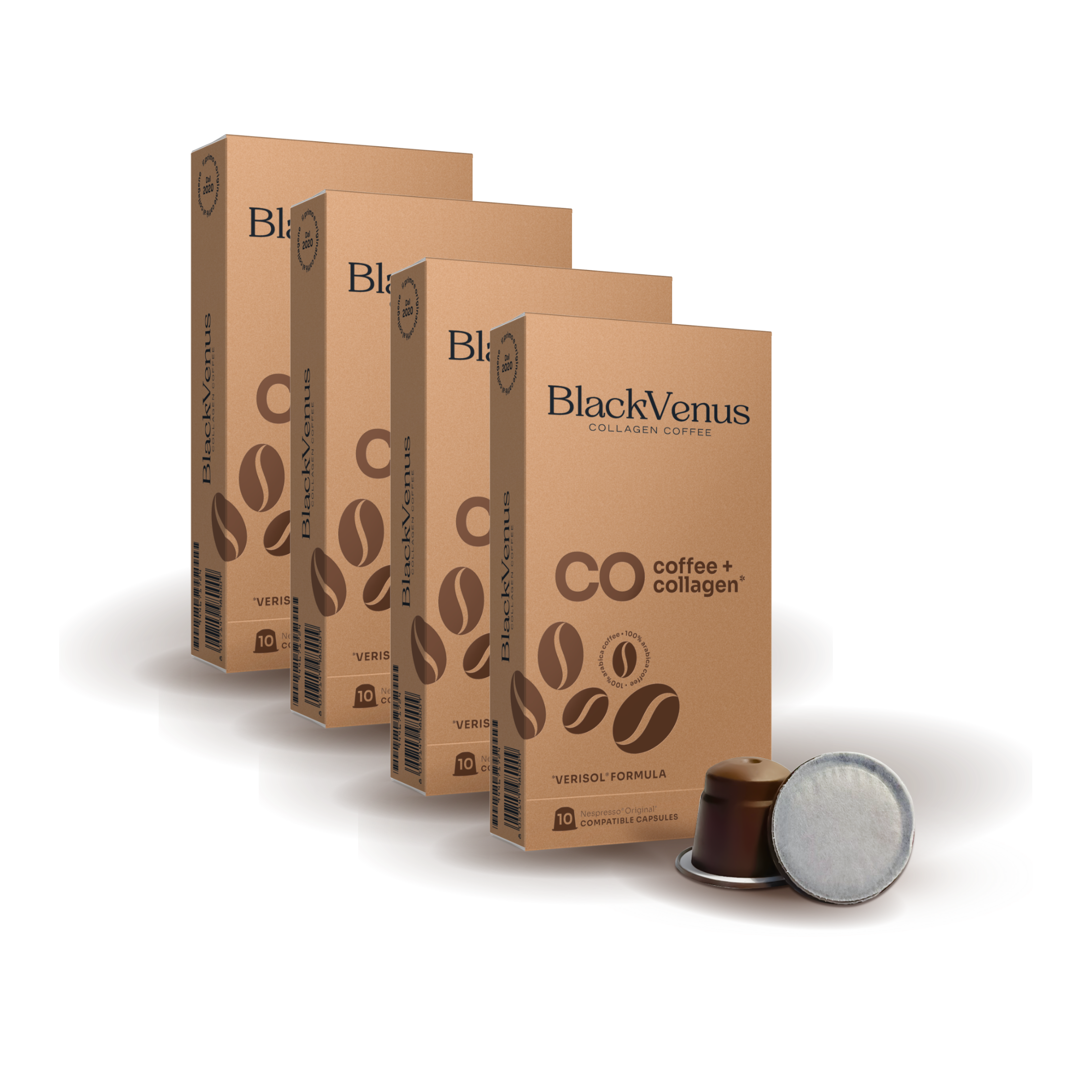 BLACK VENUS è il primo caffè macinato in capsule compatibili Nespresso® Original, tostato in Italia, che unisce le migliori miscele 100% Arabica a peptidi di collagene idrolizzato VERISOL®.